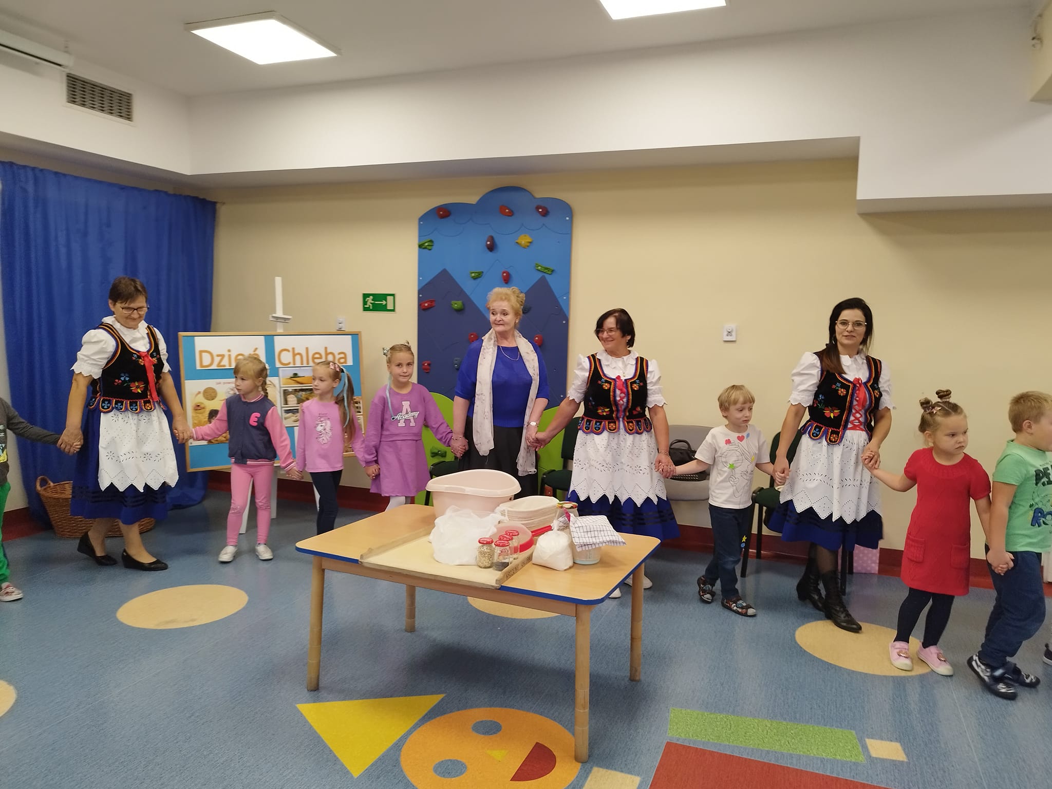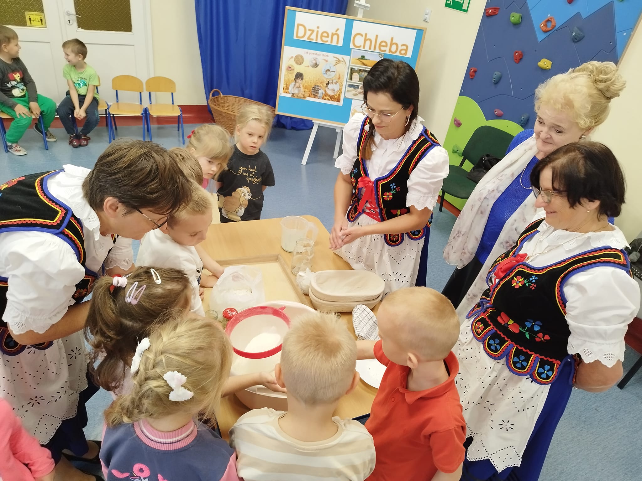 Dziś przedszkolaki obchodziły DZIEŃ CHLEBA w towarzystwie Pań z Koła Gospodyń Wiejskich KGW Rudniczanki . Dzieci nie tylko dowiedziały się w jaki sposób powstaje chleb, ale także same wzięły udział w przygotowaniu ciasta na ten wypiek. Przedszkolaki w tym dniu zamieniły się w małych piekarzy i aktywnie uczestniczyły w pieczeniu chleba. Poznały składniki potrzebne do przygotowania chleba, wyrabiały ciasto, obserwowały jak rośnie i piecze się. Poznając tajniki wypieku chleba, wykorzystaliśmy wszystkie nasze zmysły. Potem tylko czekaliśmy na efekt końcowy. Przedszkolaki chętnie zajadały się świeżym chlebem, który wspaniale zarumienił się w przedszkolnym piekarniku. Jak to mówi przysłowie "Chleb pracą nabyty, bywa smaczny i syty". Ślicznie dziękujemy Pani Ewelinie Konik, Pani Kazimierze Gieroń, Pani Justynie Gieroń, Pani Alfredzie Wawrzykowskiej, Pani Annie Olak z KGW "Rudniczanki" za lekcję edukacyjną, przepiękne prezenty, pokaz strojów, organizację oraz mile spędzony czas.