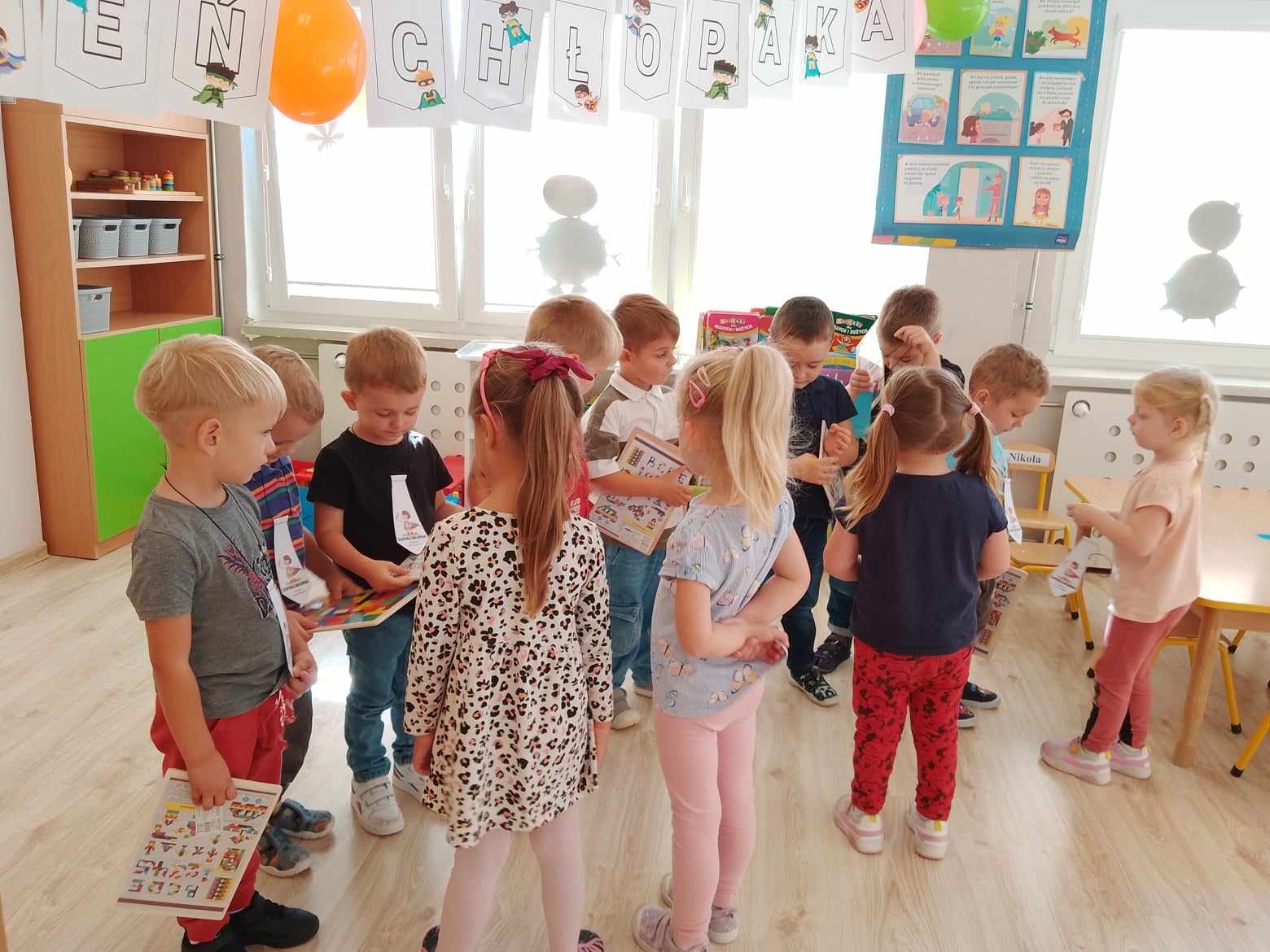 30 września obchodziliśmy Dzień Chłopaka. Z tej okazji dziewczynki przygotowały dla swoich kolegów prezenty oraz przyjęcie - niespodziankę. Nie zabrakło uroczystego odśpiewania "Sto lat" przez żeńską część społeczności przedszkolnej. Po wspólnym biesiadowaniu przy stole dzień upłynął na wspólnych grach i zabawach. Śmiech i radosne odgłosy słychać było z każdej sali, co oznaczać mogło tylko dobrze i wesoło spędzony czas.
