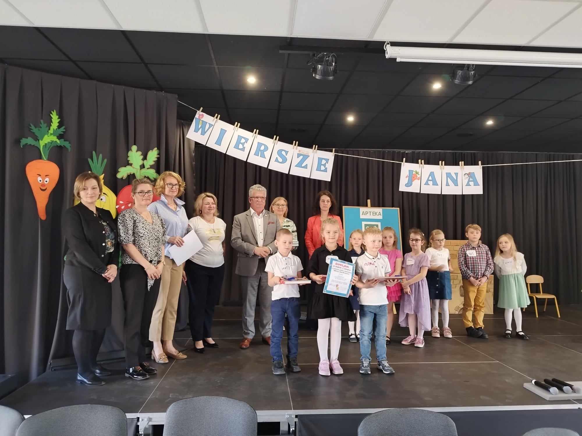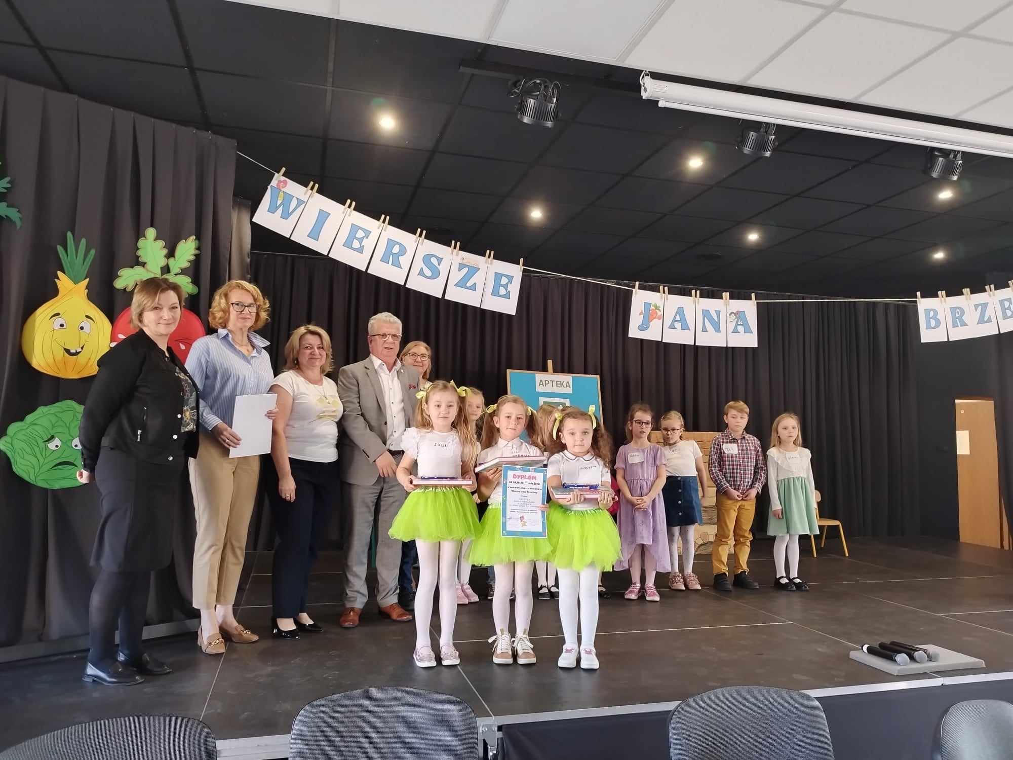 „Wiersze Jana Brzechwy” to tytuł tegorocznego gminnego konkursu wiedzy o literaturze zorganizowanego przez nasze przedszkole, pod patronatem Burmistrza Miasta i Gminy Koniecpol. W konkursie wzięły udział trzyosobowe drużyny z czterech placówek: Przedszkola nr 2 w Koniecpolu, Niepublicznego Przedszkola „Jaś i Małgosia” w Koniecpolu, Szkoły Podstawowej w Rudnikach im. Powstańców Styczniowych oraz Przedszkola nr 1 w Koniecpolu. Zmagania wszystkich drużyn oceniało jury w składzie: p. Arleta Olszewska- Lorin- dyrektor Domu Kultury w Koniecpolu, p. Małgorzata Gołębiowska- wicedyrektor Szkoły Podstawowej nr 2 w Koniecpolu oraz p. Zofia Kaniewska- kierownik Biblioteki Publicznej w Koniecpolu. Honorowymi gośćmi konkursu byli Burmistrz Miasta i Gminy - p. Ryszard Suliga oraz Dyrektor Urzędu - p. Dariusz Saternus, natomiast rolę gospodarza wydarzenia pełniła Dyrektor Przedszkola nr 1 w Koniecpolu - p. Bożena Sygit. Wszystkie drużyny biorące udział w konkursie świetnie poradziły sobie z przygotowanymi konkurencjami dotyczącymi wybranych wierszy Jana Brzechwy. Doskonale wiedziały, z jakiego utworu pochodzą wybrane cytaty, odpowiednio dopasowały rekwizyty do wierszy, potrafiły dokończyć wybrane fragmenty wierszy, wiedziały jakie warzywa występowały w utworze „Na straganie”, świetnie poradziły sobie również z kalamburami i z innymi zadaniami. W przerwach pomiędzy konkurencjami uczestnicy mieli okazję obejrzeć występy artystyczne dzieci z grupy „Pszczółki”- przedszkolaki zaprezentowały piosenki: „Witajcie w naszej bajce” i „Kaczka Dziwaczka” oraz wiersze: „Tańcowała igła z nitką” i „Żuk”. Na koniec, po podsumowaniu przez jury punktów, burmistrz - p. Ryszard Suliga wręczył drużynom dyplomy, a wszystkim zawodnikom nagrody książkowe ufundowane przez Urząd Miasta i Gminy w Koniecpolu: