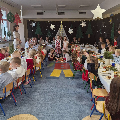 Wigilia Bożego Narodzenia to wyjątkowy dzień dla przedszkolnej społeczności. Dla podkreślenia ważności tego dnia, przedszkolaki przybyły do przedszkola odświętnie ubrane. Zgodnie z tradycją pod białym obrusem znalazło się sianko, a na stole zagościł opłatek, czerwony barszcz, kapusta z grochem, ryba, makowiec. Śpiew kolęd i pastorałek wprowadził wszystkich w uroczysty nastrój i radość w oczekiwaniu na zbliżające się Święta Bożego Narodzenia, które nie mogą przyjść do nas bez świątecznych dekoracji, ozdabiających nasze domy, okna, stoły wigilijne.