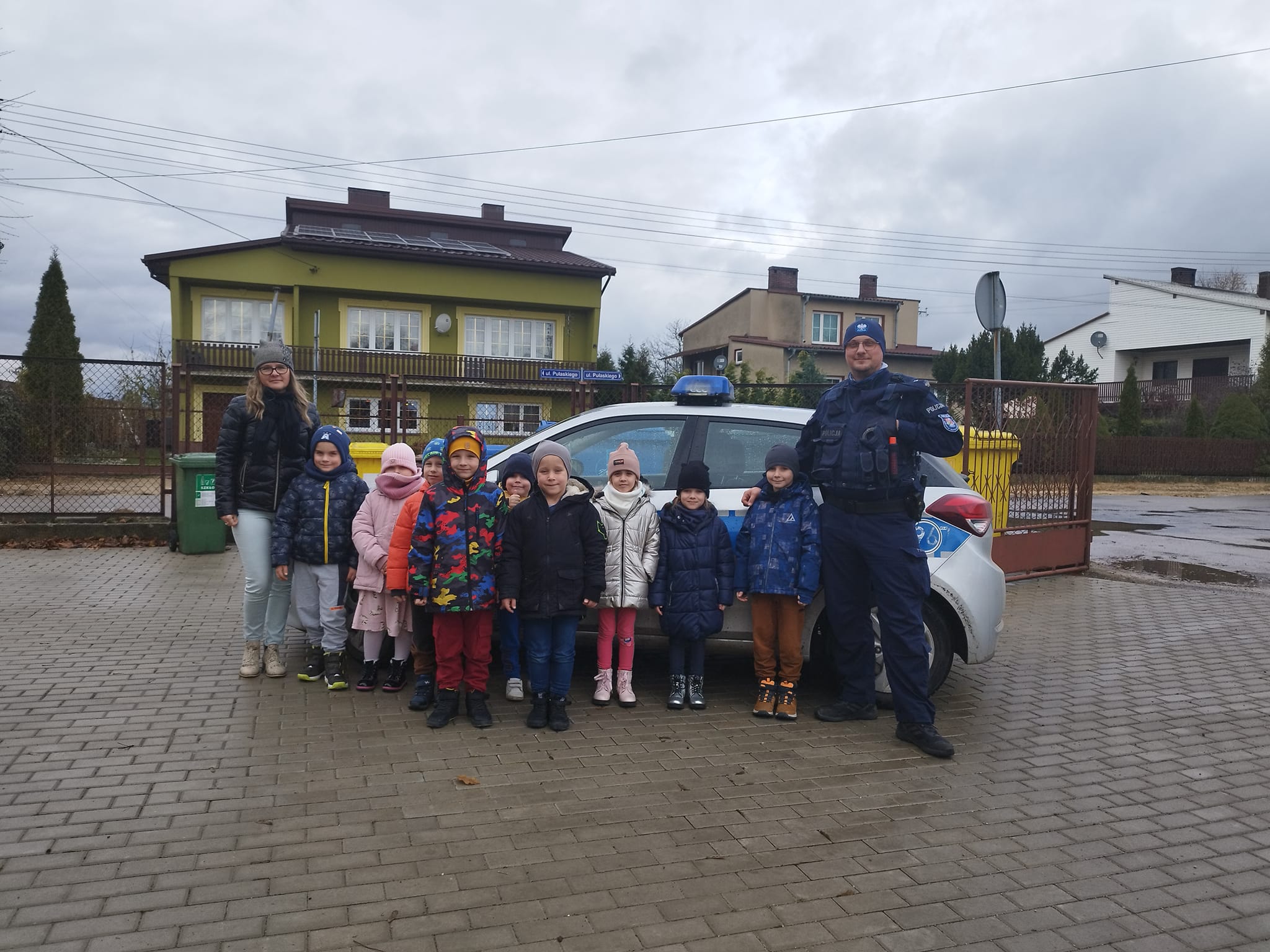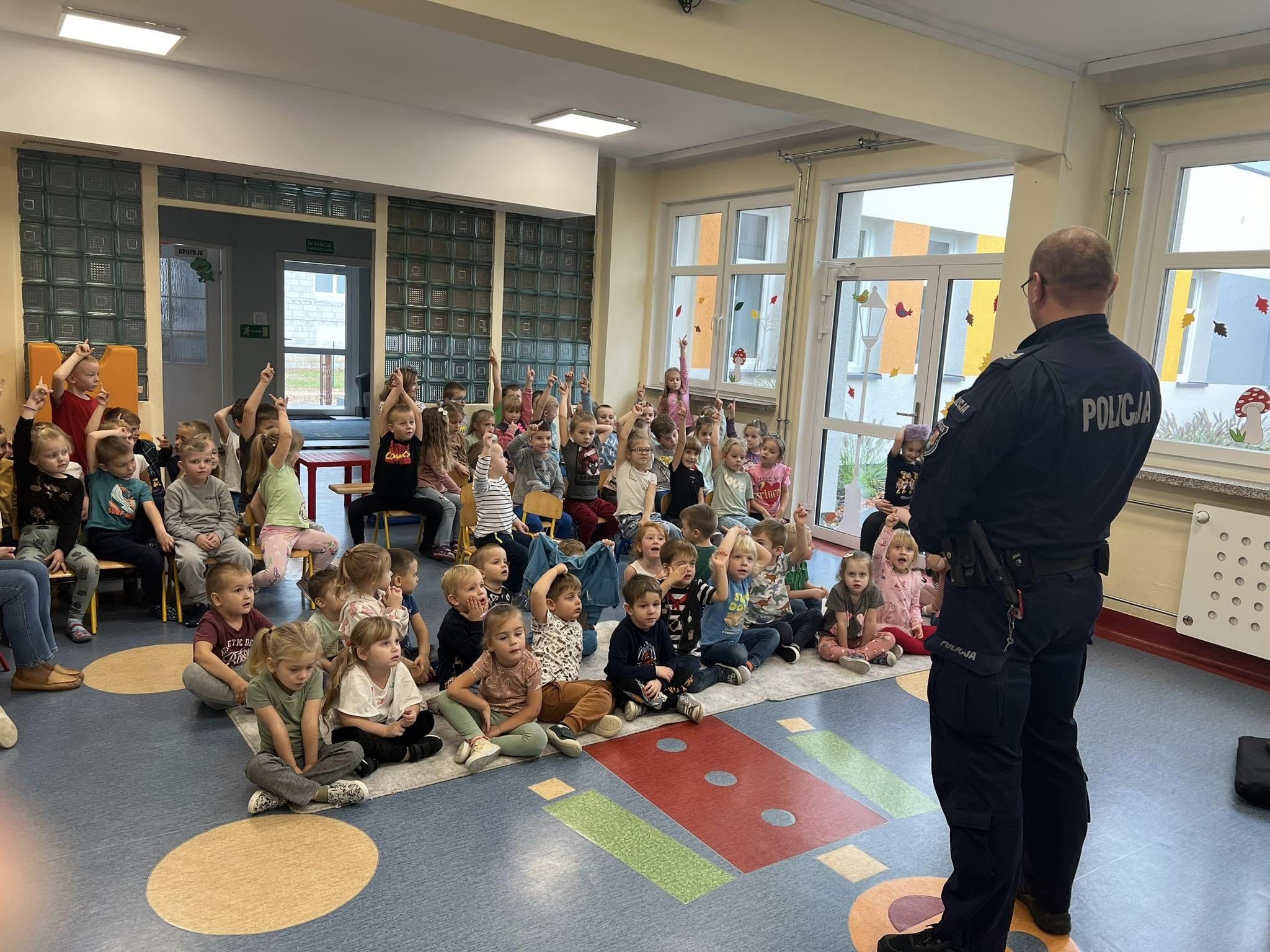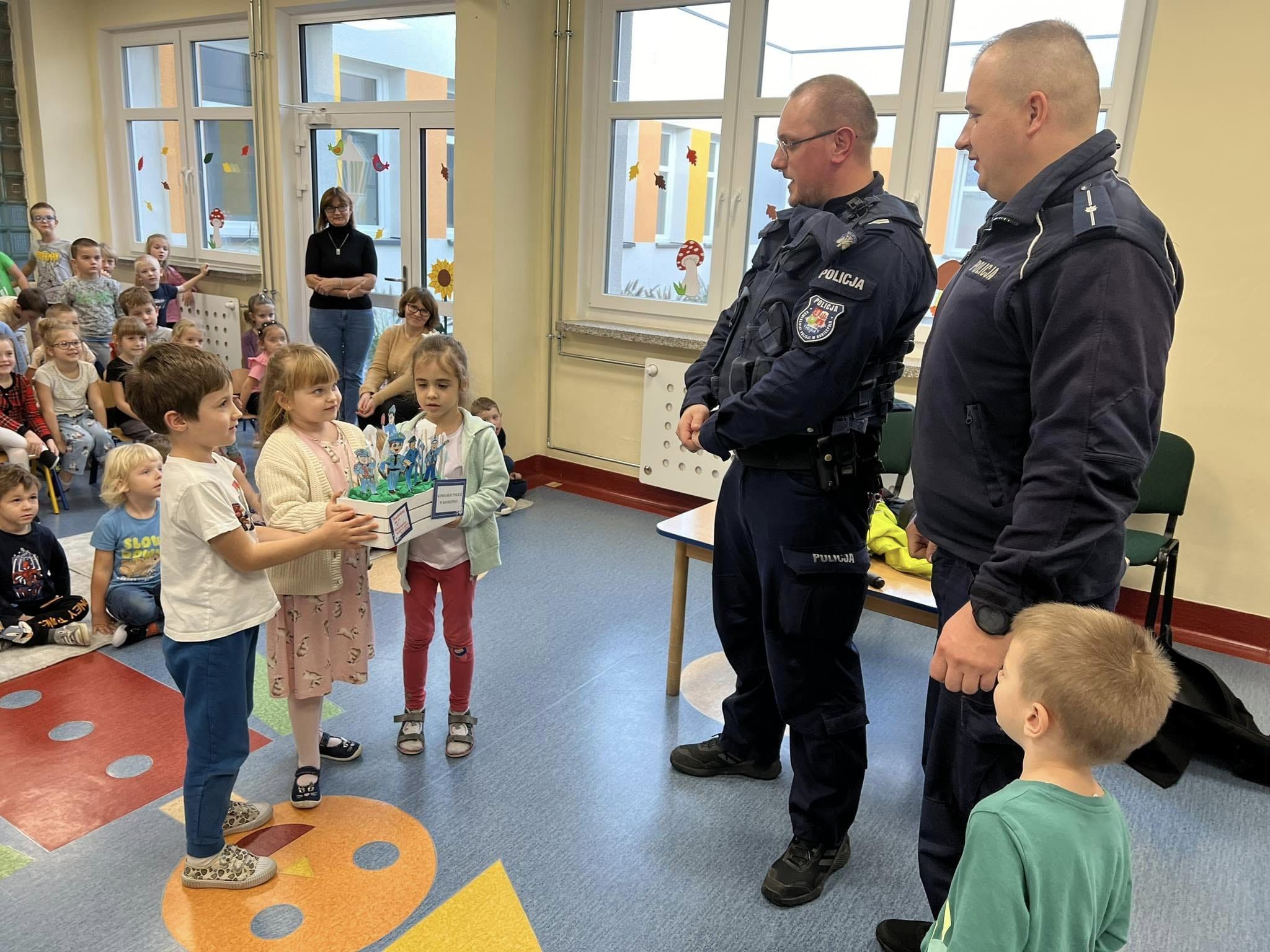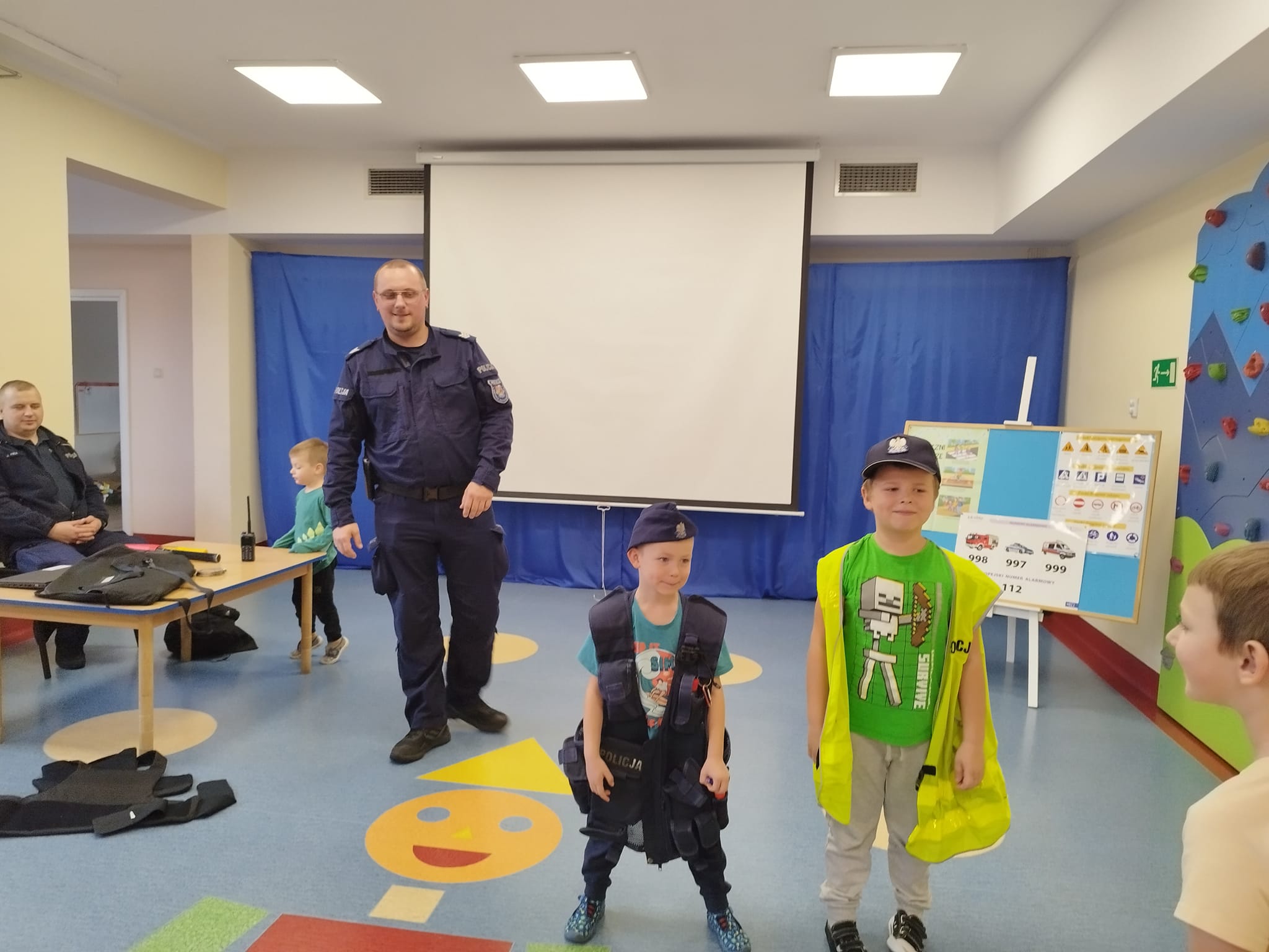 Dziś przedszkolaki gościły u siebie policjantów z Komisariatu Policji w Koniecpolu. Panowie przeprowadzili pogadankę na temat bezpieczeństwa oraz przybliżyli dzieciom specyfikę pracy policjanta. Rozmawiali z dziećmi na temat konieczności przestrzegania przepisów ruchu drogowego, zasad bezpiecznego przechodzenia przez drogę oraz jakie numery alarmowe powinien znać każdy, aby wezwać pomoc w razie potrzeby. Szczególnym zainteresowaniem wśród dzieci cieszyła się prezentacja wyposażenia policyjnego, niezbędnego podczas wykonywania pracy. Dużą atrakcją był także radiowóz policyjny, który zaparkował na terenie naszego przedszkola.