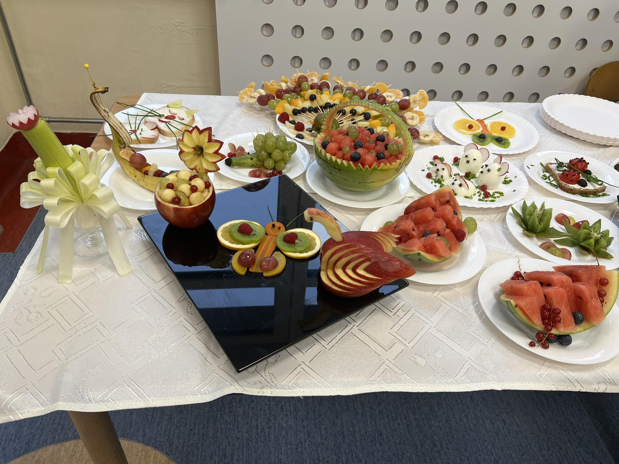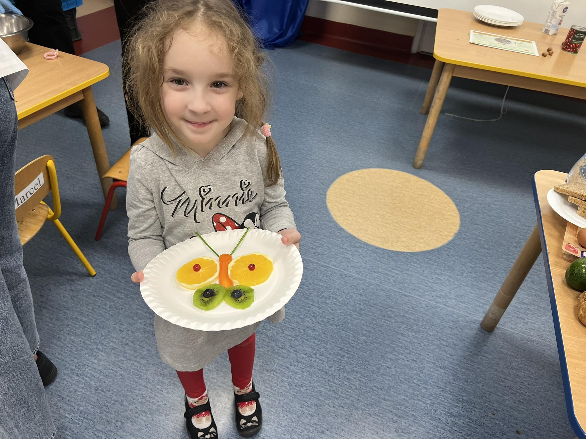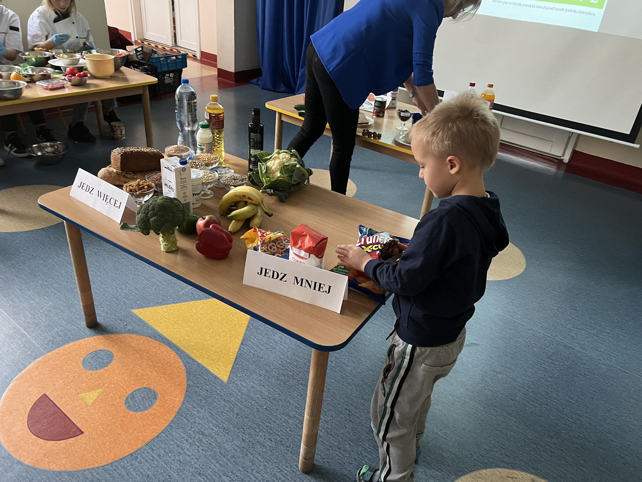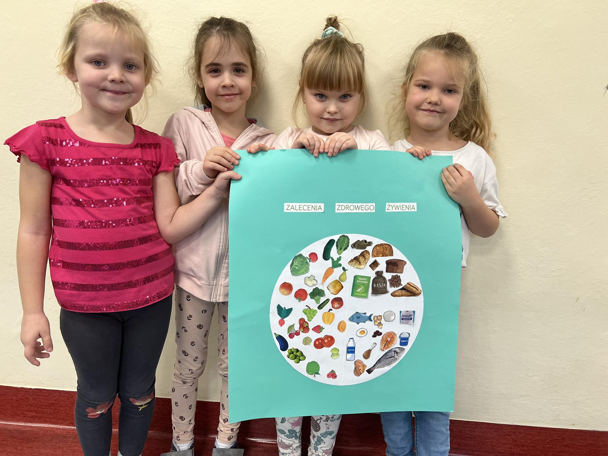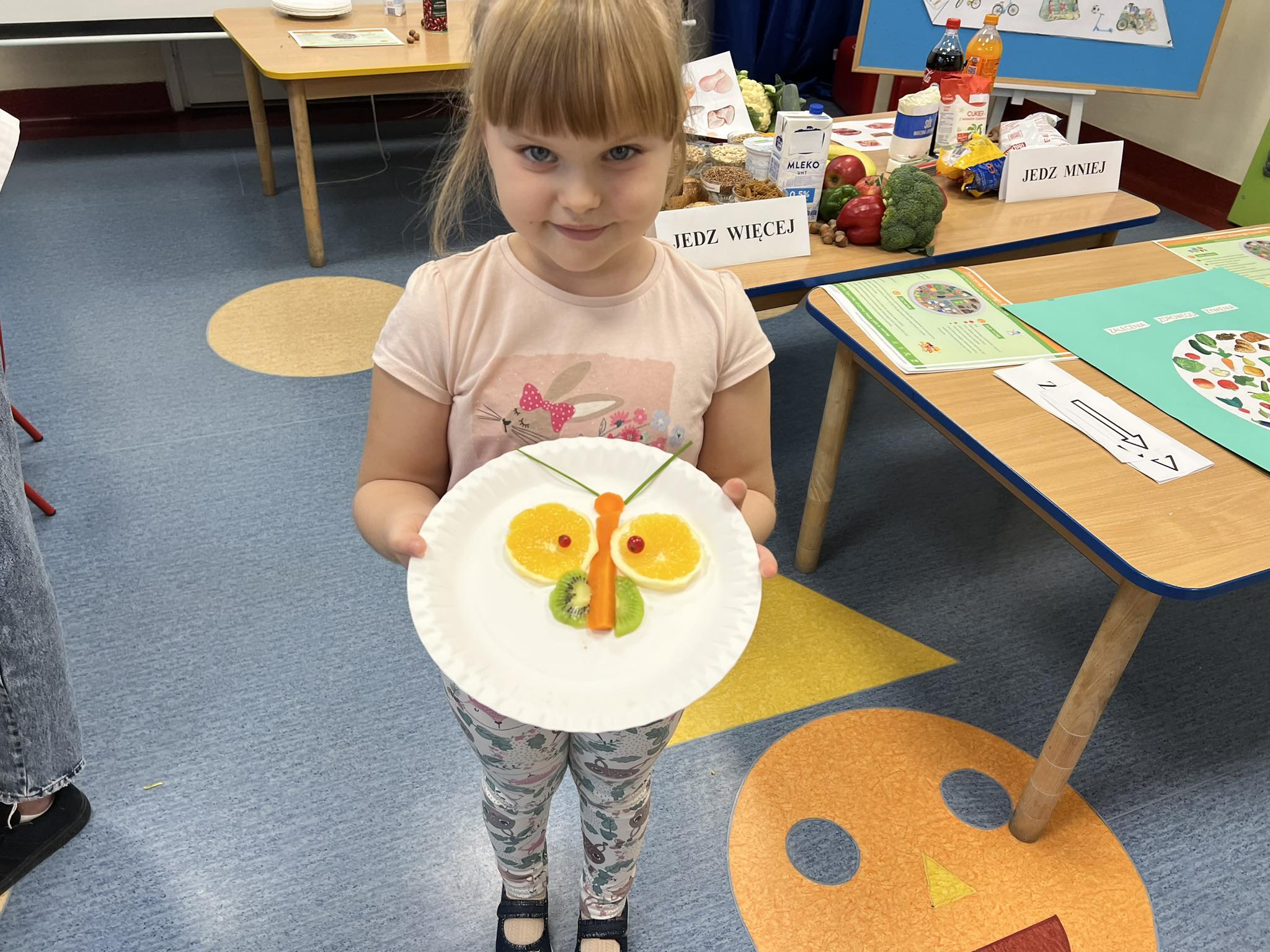 W listopadzie wszystkie grupy w naszym przedszkolu omawiały tematykę zdrowego żywienia. W celu podsumowania i usystematyzowania zdobytej wiedzy, zaprosiliśmy uczniów Zespołu Szkół w Koniecpolu wraz z nauczycielką Małgorzatą Janiszewską o przedstawienie zasad zdrowego żywienia. Przedszkolaki samodzielnie segregowały żywność na zdrową i niezdrową, przypomniały zalecenia zawarte w piramidzie zdrowego żywienia. Pani Małgorzata zaprezentowała talerz zdrowego żywienia i przypomniała o konieczności spożywania 5 pełnowartościowych posiłków dziennie. Później, dzięki zdobytym wiadomościom, dzieci miały możliwość graficznego przedstawienia w formie talerza zdrowej żywności, jakie produkty powinny znaleźć się w ich codziennej diecie, a których należy unikać. Atrakcyjnym zadaniem okazało się samodzielne komponowanie z owoców i warzyw motylków zgodnie z podanym wzorem, przygotowanym przez uczennice Zespołu Szkół. Wszystkie motylki bardzo szybko znikały w dziecięcych brzuszkach. Udział w spotkaniu przyczynił się do pogłębienia wiedzy przedszkolaków o zdrowym stylu życia, który wydatnie wpływa na zdrowie i samopoczucie dzieci. Dziękujemy za ciekawą prelekcję.